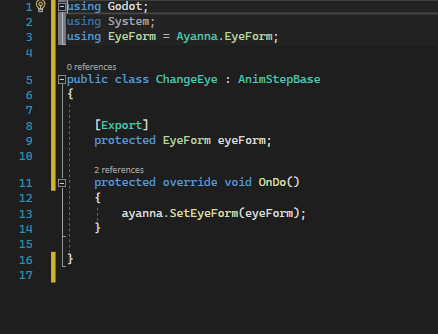 This block, for example, inherits from a base class for Ayanna’s animations – and changes the active sprite for her pupil.