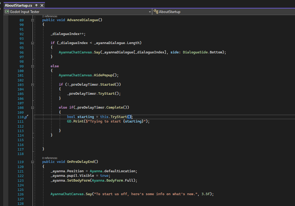 At the time of my original test, I was already working on a system that managed the intros and outros of each level. So, when I needed to test displaying text, I just hard-coded Ayanna’s introduction into it, as an override to the normal intro script.