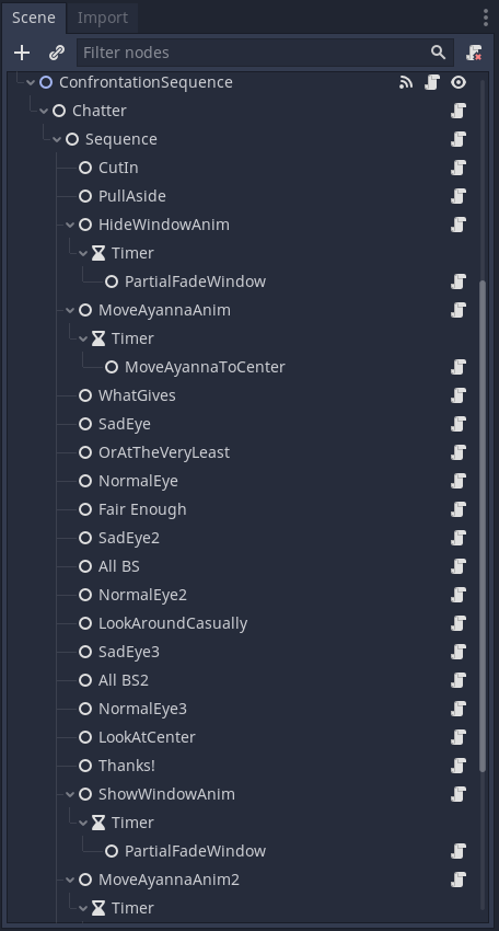 As intended, this system is very modular, and pretty easy to organize. In theory, with the way Godot’s nodes work, I could even cordon these sequences off into their own scenes, if I wanted to reuse them somewhere. Or was just sick of big hierarchies.