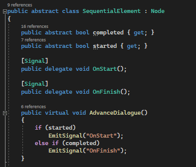 Each node inherits from a base class for sequence elements – which provides the basic framework for checking if they are completed or not.