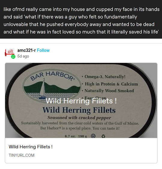 While its presence is most certainly unwanted, a scam bot deciding to try and sell herring fillets under a Tumblr post about Our Flag Means Death is, objectively, a very funny thing to do.